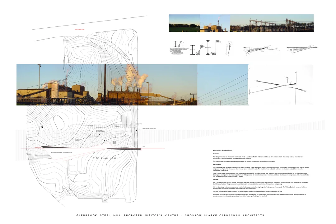 It is a pleasant journey to reach the site. Negotiating ones way through rich pastoral land, the Glenbrook Steel Mill is located amongst rural properties on the edge ofthe Manukau Harbour. The presence of industrial activity is concealed behind a perimeter of mature trees and planting.