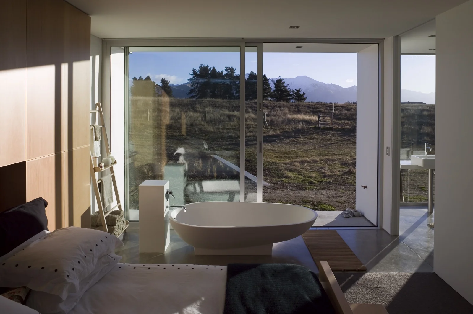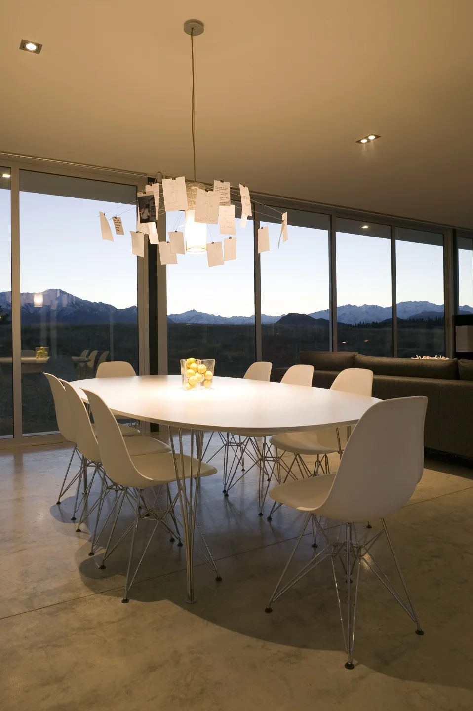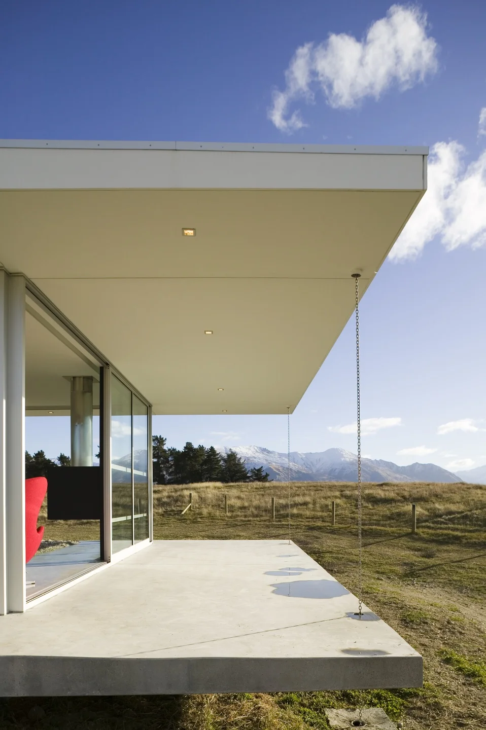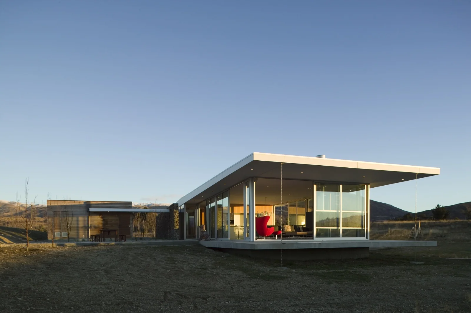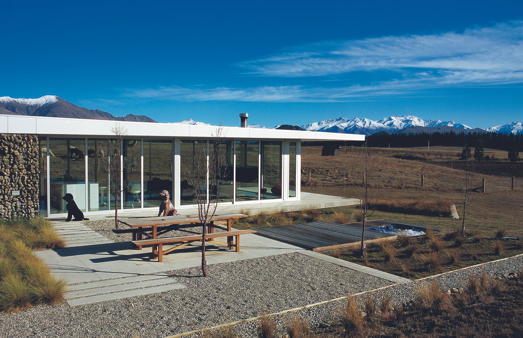 The house is low slung and nestled into the landscape, wedged into a gentle gully on the site, allowing for privacy from surrounding dwellings and protection from the northwesterly wind. The house is elegant and transparent, an object touching the land lightly.