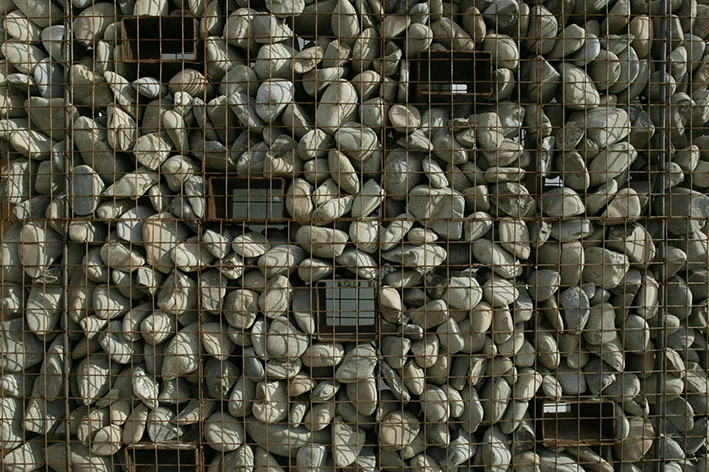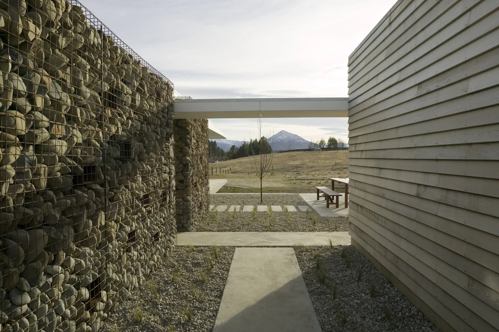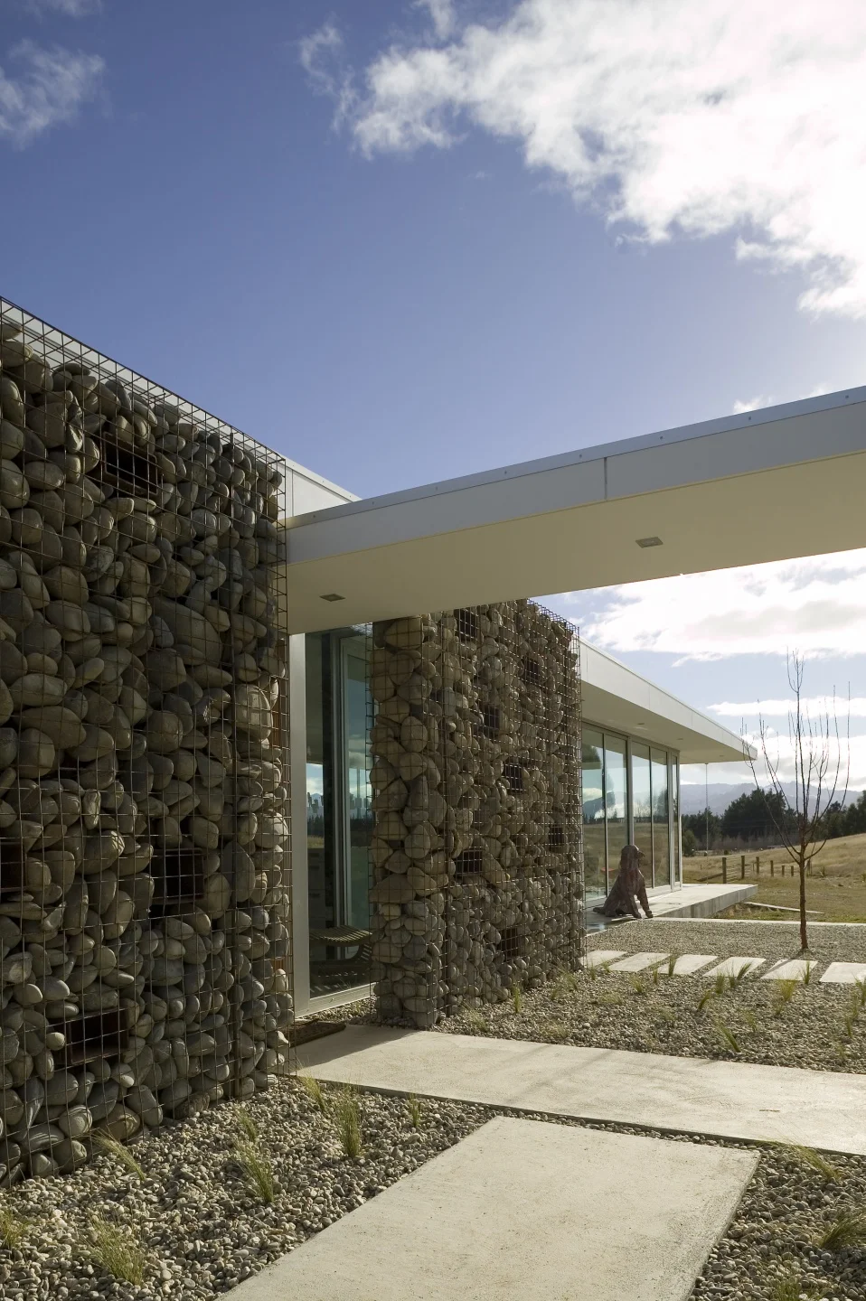 The garage to the east is disconnected from the main house allowing for a modulation of the built forms in the landscape. This is also the entry point to the house, moving between the timber garage wall along a sculpted gabion wall. Steel sections placed in this wall provide light shafts into the east of the house.
