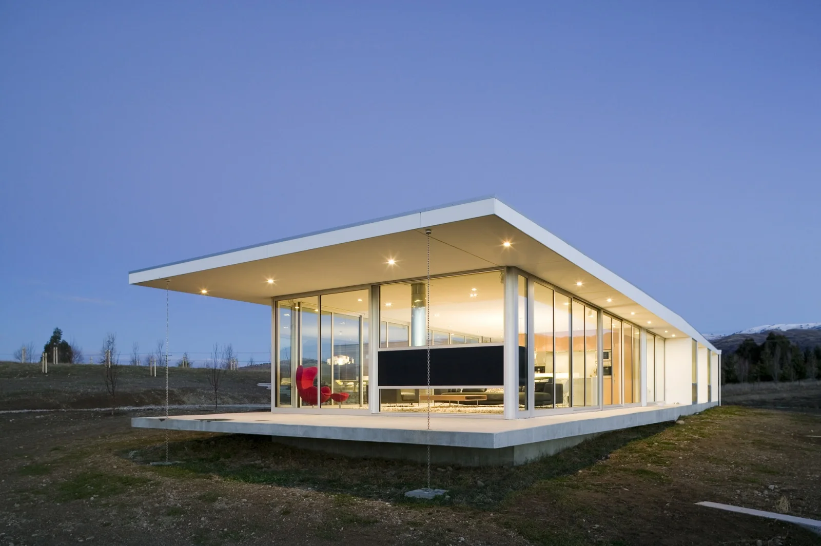 The house is low slung and nestled into the landscape, wedged into a gentle gully on the site, allowing for privacy from surrounding dwellings and protection from the northwesterly wind. The house is elegant and transparent, an object touching the land lightly.